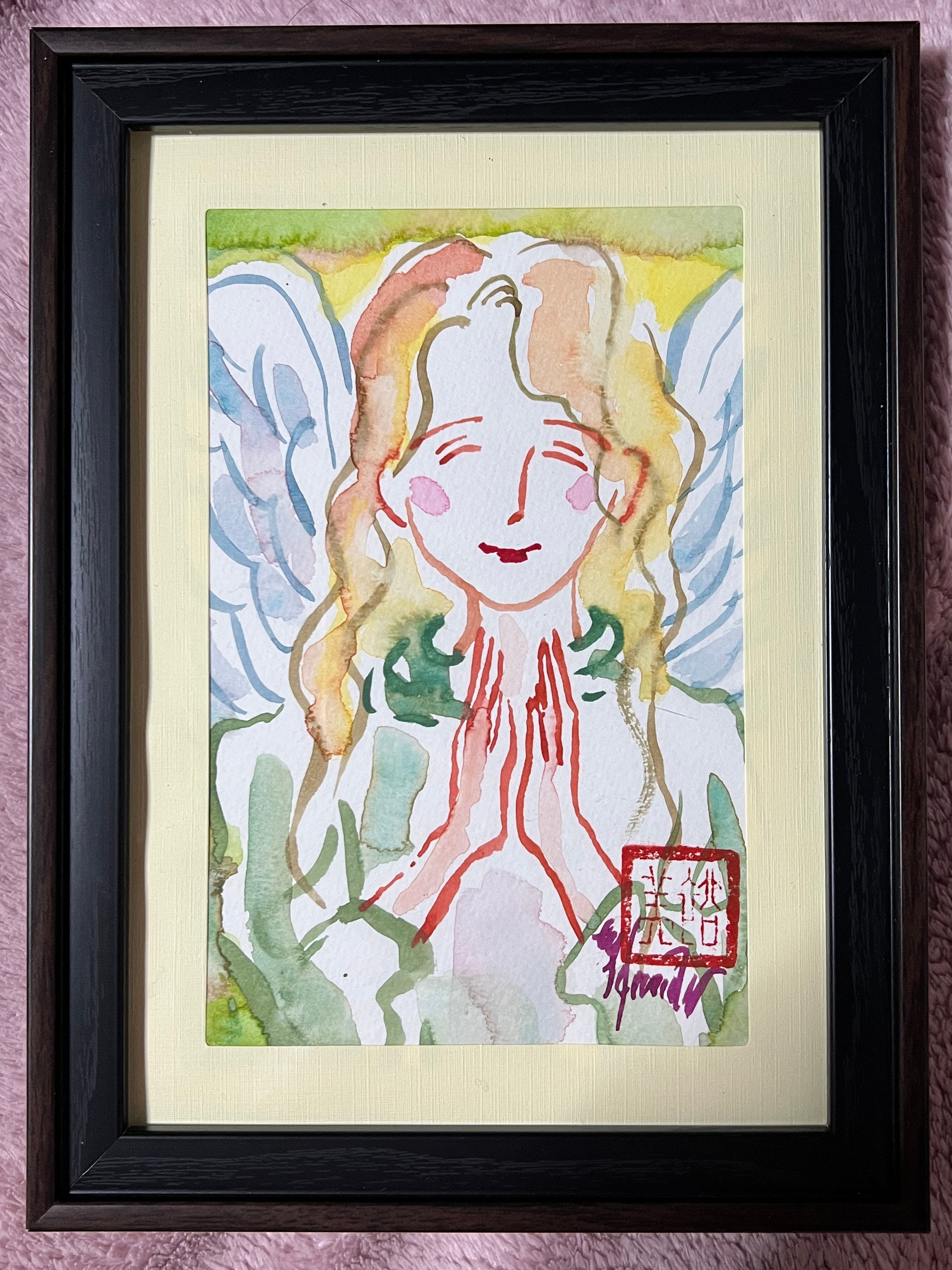 支持体は水彩紙、ハガキサイズ。美しい額に額装してお届けします。